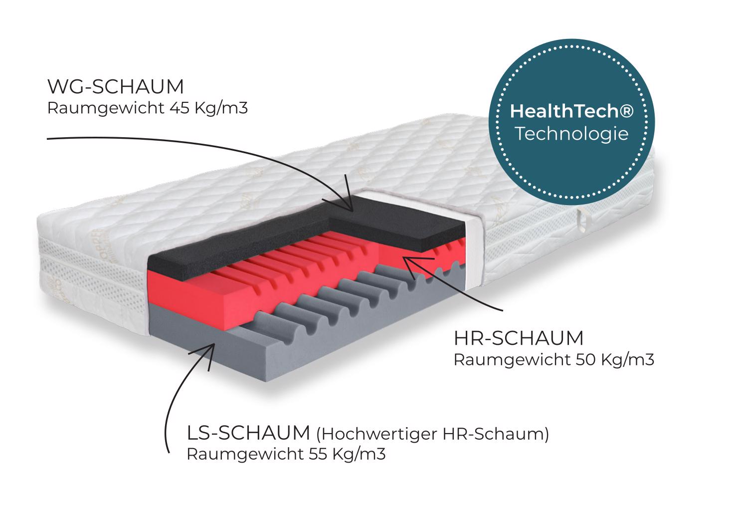 Im Inneren kombiniert die Matratze LS-Schaum und hochdichten HR-Schaum, die gemeinsam optimale Stabilität und Druckentlastung bieten. Die obere Komfortschicht besteht aus Watergel® Family mit HealthTech®-Technologie, die an der Universität Padua (Department of Molecular Medicine) getestet wurde.