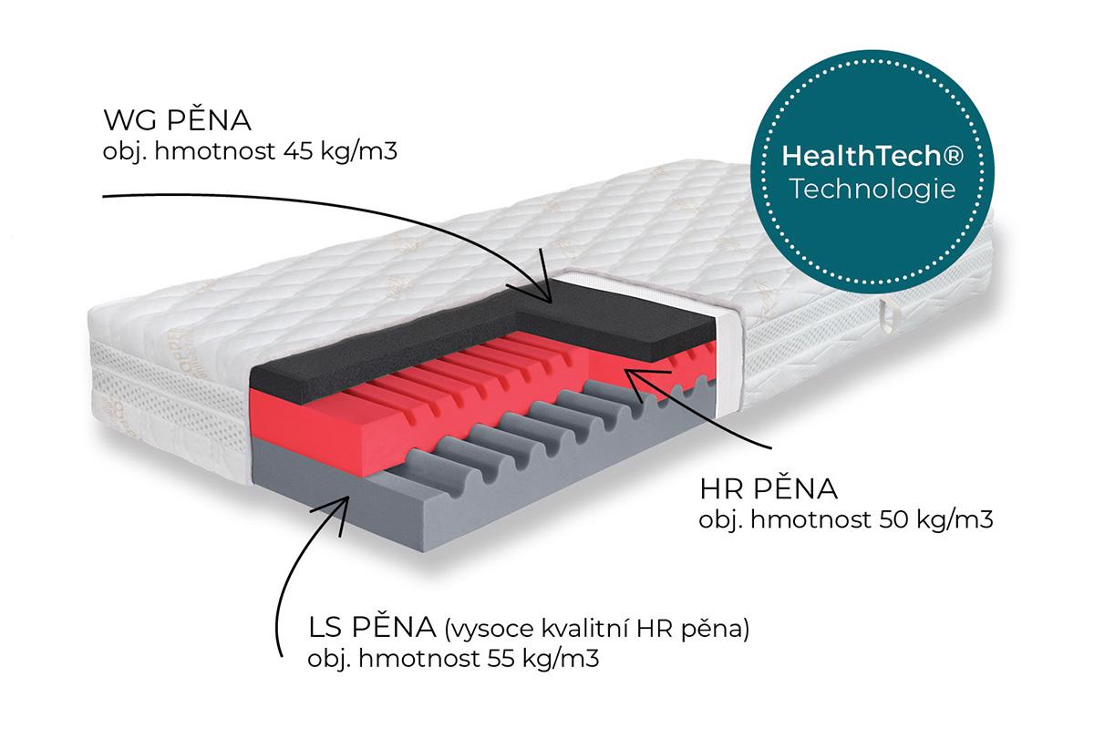 Srdcem matrace je kombinace LS pěny a HR pěny s vysokou hustotou, která poskytuje dokonalou rovnováhu mezi pevností a pružností. Horní komfortní vrstvu tvoří Watergel® Family s technologií HealthTech® – materiál, který byl testován na Univerzitě v Padově (Department of Molecular Medicine).